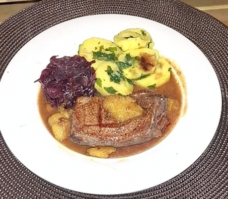 Heilig Abend: Gegrillte Gänsebrust an Orangensoße mit Blaukraut und Kartoffel;