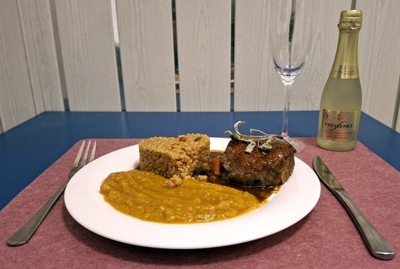 1. Feiertag: Lammsteak zu Butternutkürbis-Püree und Bulgur mit Salbeisoße;