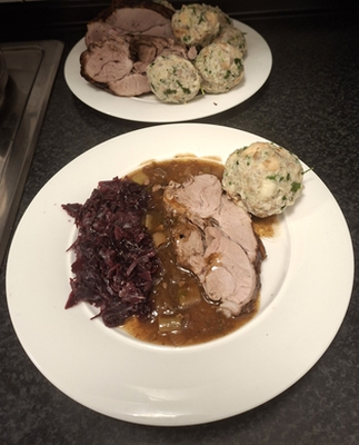 2. Feiertag: Blaukraut, Semmelknödel, Wildschweinbraten an Roseweinsoße