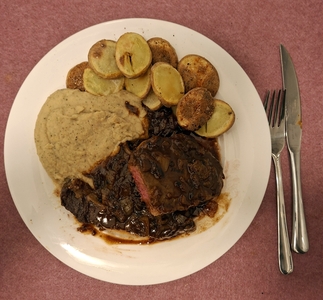 Ein auf den Punkt gebratenes Rinder Entrecôte mit weißem Bohnen-Pastinaken Püree, gepoppten Kartoffeln an einer dunklen Bier-Zwiebel-Soße.