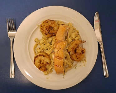 Lachs mit Gambas auf Tagliatelle an Gorgonzola-Dill-Soße